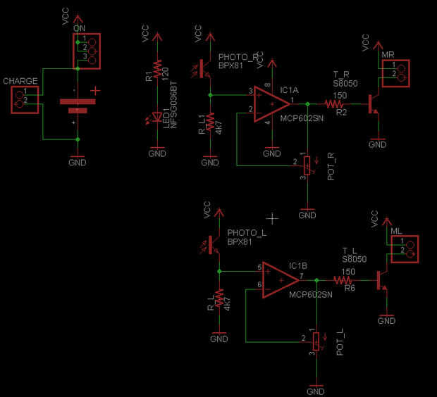 Allí es un LED IR apuntando hacia abajo en la parte frontal del robot, la luz reflejada es detectada por dos fototransistores, entonces, la señal de voltaje se envía a lo op-amp y enviar más o menos corriente para el motor (a través de un transistor NPN) dependiendo de la ganancia, ajustado con el pote de regeneración.