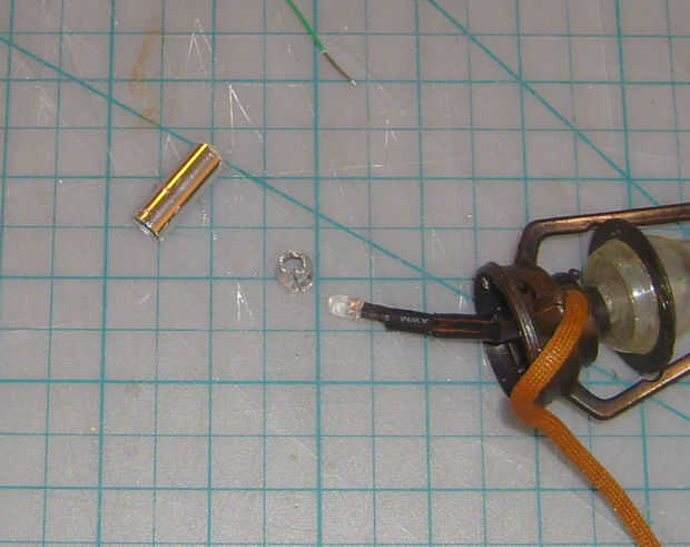 Igual necesitábamos algo para sostener el cable en su lugar en la base de la linterna, también necesitaremos algo para sujetar la bombilla en su lugar. Esto es donde un pedazo de aluminio de desecho de la original lámpara USB viene bien. Corte un pedazo pequeño del extremo cónico del tubo de aluminio, para encajar en el agujero perforado en el vientre de la linterna. (Esto servirá como una toma de la lámpara LED). Mueva la bombilla en su lugar, hasta su pegarse verticalmente dentro de la flauta y luego fuerza la pieza de aluminio en apretado con el tus alicates, para mantener la bombilla en su lugar. (Tenga cuidado de no cortar los cables).