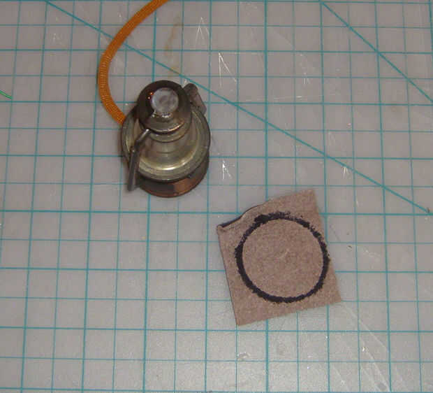 Una vez que haya secado la pieza de plástico pegada, estarás listo para dar los últimos toques en la base. Poner la placa base original que usted oró de nuevo en la base de la linterna. Si no se queda en su lugar, probar un poco de pegamento. Elegir un trozo de tela para cubrir la base. Decidí ir con un pedazo de cuero que rescató de un sofá desechado.