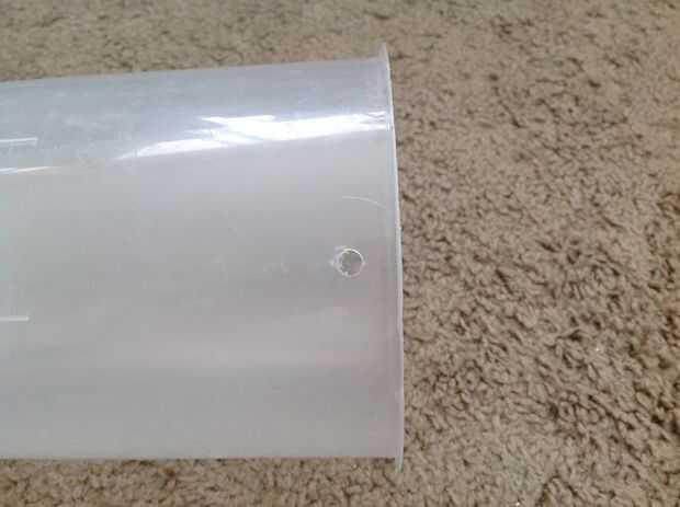 Lo primero que hice fue hacer un agujero en la parte superior de dos envases vacíos de CD cuenta 100. Un agujero en el costado cerca del extremo abierto de cada uno era permitir que el tubo de suministro de nutrientes para ejecutarse a través de. La portada del CD que sería en la parte superior también tenía un agujero ligeramente más grande perforado a través. Este agujero se utilizarían para instalar un sifón de bell. Se hizo un agujero más en la parte inferior para permitir que los fluidos de goteo hacia el depósito en caso de que la bomba esté apagado antes el agua drenado a través del sifón de bell.