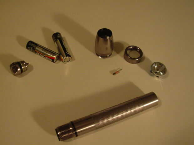 Ahora desmontamos los componentes principales en la linterna. Estos incluyen el mango principal, las pilas, la rosca cosita en la espalda, la cabeza, el reflector de la tapa delantera y por supuesto, el bulbo original. Herramientas no son necesarias para esto, es todo atornillada y fácilmente viene aparte.