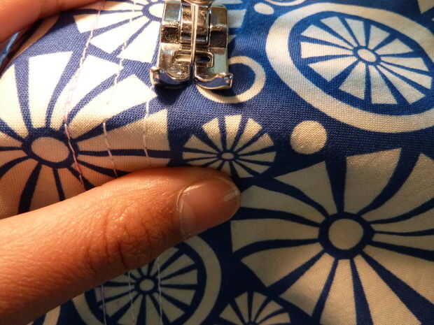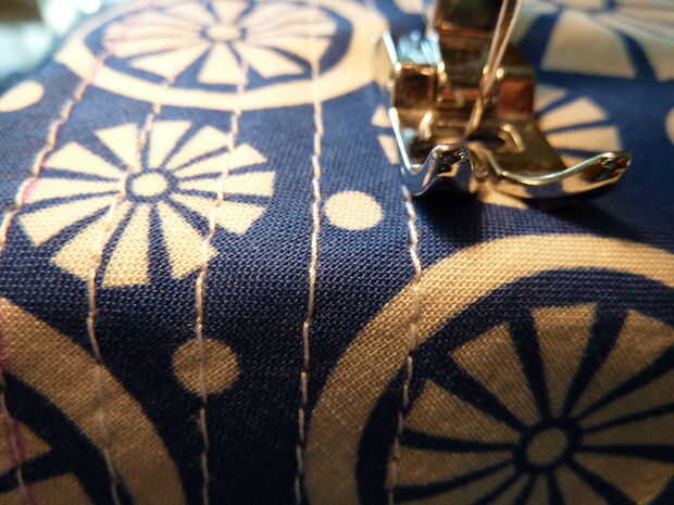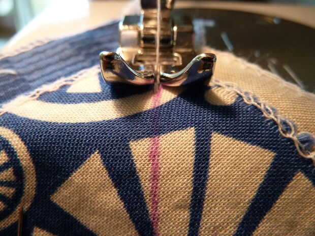 lado derecho con la línea que marcó, coser recto como sea posible a partir de una esquina. Esta es la línea más importante que usted coserá porque actuará como una guía para la línea de otros, y que línea actúan como una guía para la línea siguiente y así sucesivamente.