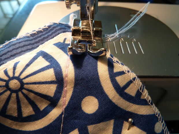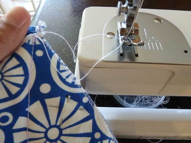 En el extremo de la línea (la otra esquina), no cortar la cadena. En su lugar, sacar el pie, gire la manta alrededor y coser otra vez. Alinee el lado de los pies con la primera línea. (Véase el cuadro 3)