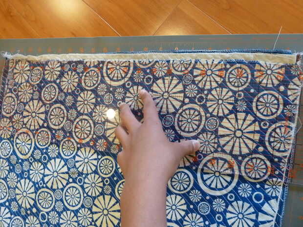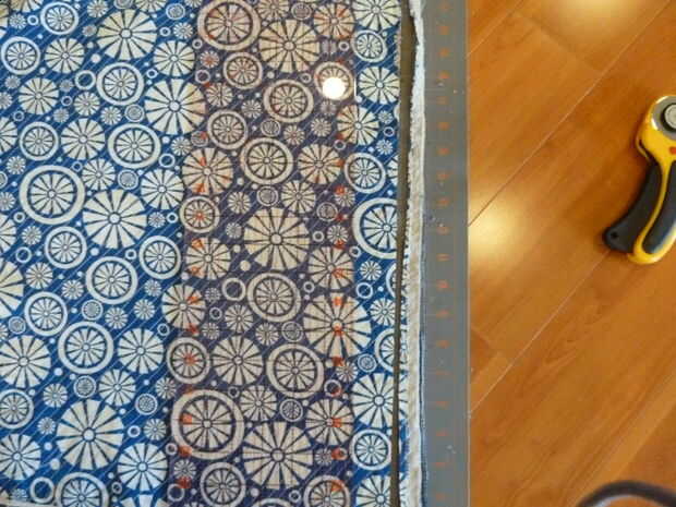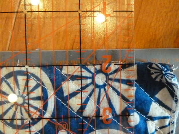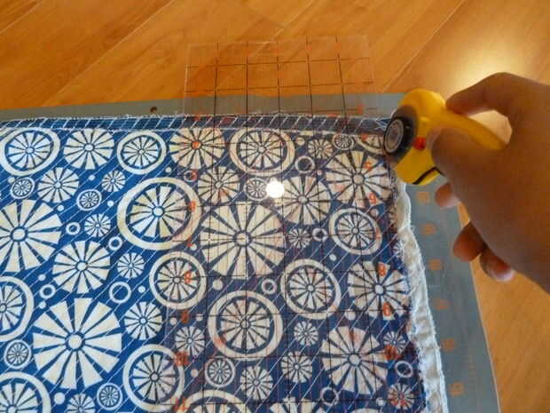 Coloque la regla larga de un lado y cortar la tela sobrante. Ahora con esta recta como guía, alinee la línea negra en su regla con el borde de corte limpio. Corte por esta línea. Repita para los otros lados.