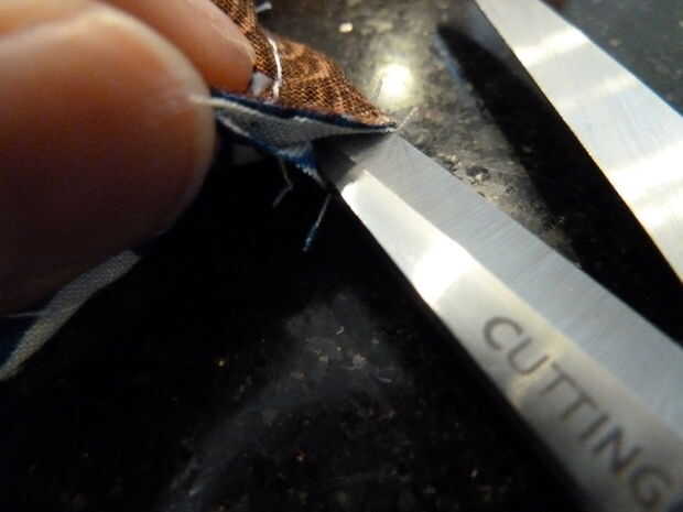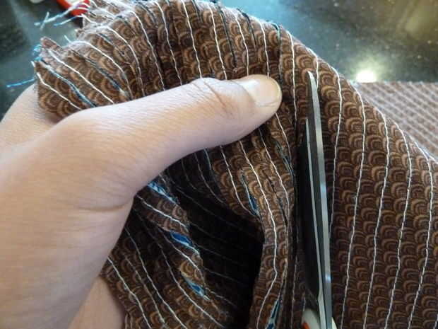 Punta: ayudará si pones la mano que no corte con en la parte inferior de la tela para asegurarse de que sus tijeras no piercing a través del tejido de la espalda. Esto me pasó, así que había que enmendar con cinta fusible y otro pedazo de la tela de.