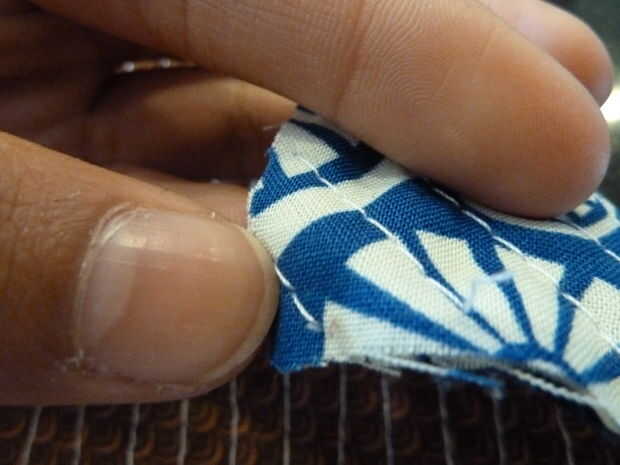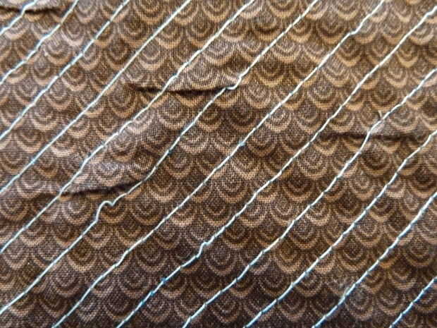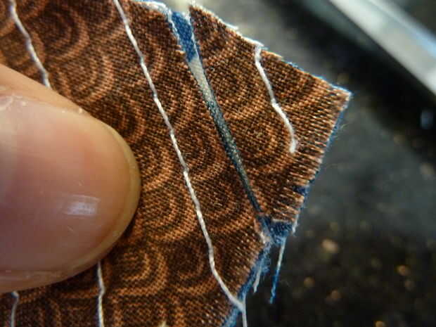 A partir de una esquina y con el revés hacia arriba, mueva la incertidumbre final puntiagudo la primera capa (bastante cara) y las otras tres capas. Deslice la cuchilla hacia abajo el "carril". Repita para los otros carriles (entre dos líneas de costura)