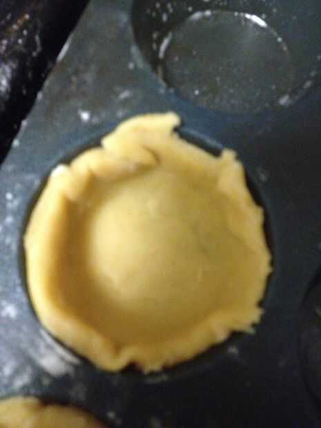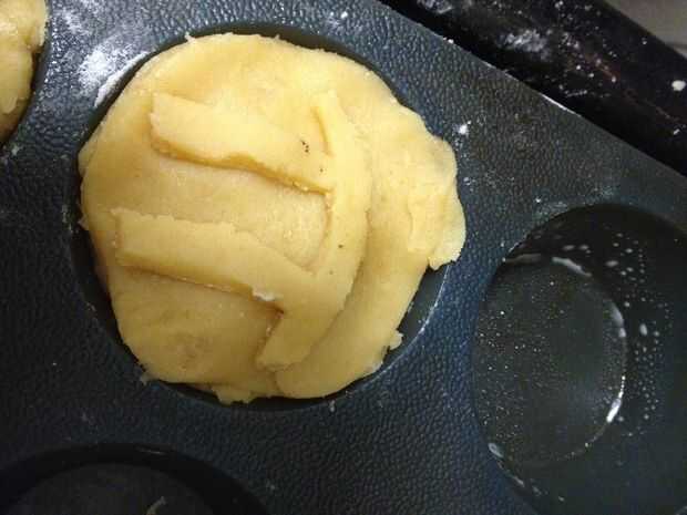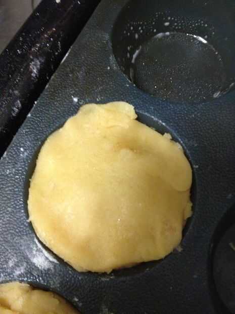 Poner una dos veces tan grande en un muffin (engrasado, opcional) orificio y empújela en y alrededor de los lados. Poner la manzana en él. sellar con la otra masa y añadir la pieza en forma de pi en la parte superior. Poner unos agujeros en la parte superior (alrededor de pi) con un cuchillo.