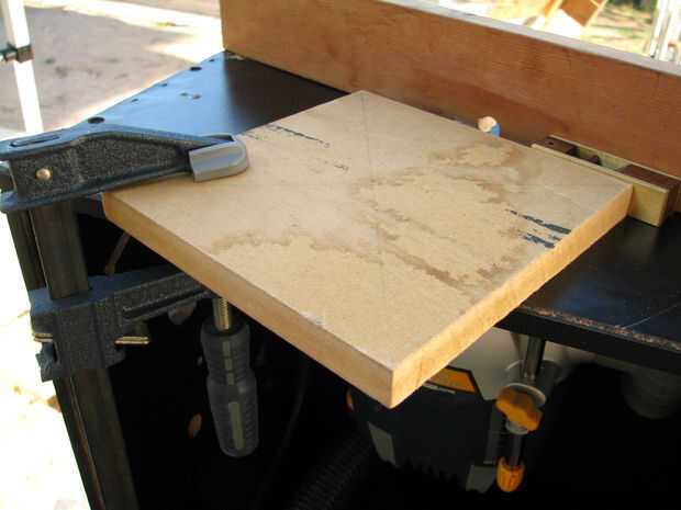 La valla establecido, coloque el avión contra él cerca de la broca de fresadora en la mesa y con un bloque de la guía de la abrazadera (cortes rectos hará) contra él, en paralelo con la cerca. Esto evitará el corte en el blanco, si usted piensa que necesitará el apoyo extra.