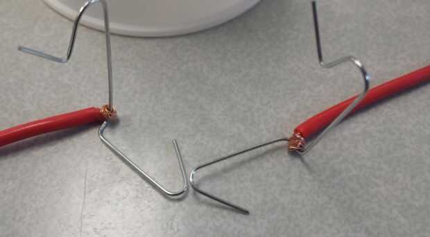 Que necesitamos grabar los clips a la Copa y han los cables de cobre a los ganchos para que podemos transferir actual. Sólo necesitamos algún tipo de contacto entre el cobre expuesto y los clips de papel, embalaje seguro y torcer el cobre alrededor de los clips probablemente será suficiente.