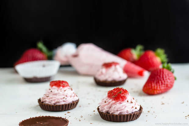 7. Tome los casos de la Magdalena de su congelador. Eliminar los casos. Colóquelas en una plato/bandeja de la porción. La mousse sobre los chocolates (quieras) de la pipa, cubra con fresas ronroneó y virutas de chocolate!