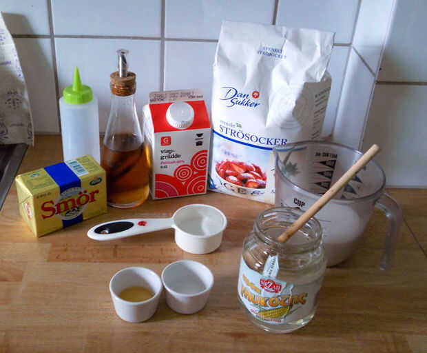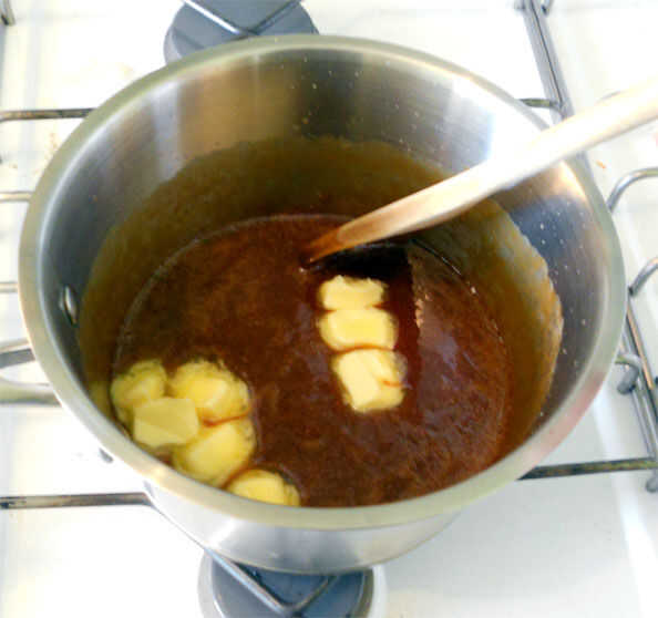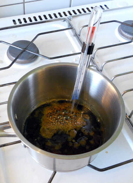 1. Ponga el azúcar, el jarabe de maíz y el agua en una cacerola con fondo grueso y ponga a fuego medio. Utilice una cacerola más grande que usted cree que necesita. Llevar a ebullición y deje continuar la cocción hasta que quede un color cobre oscuro rico, 6-8 minutos. Retirar del fuego y deje enfriar por un minuto o dos. No déjelo enfriar hasta que endurezca.
