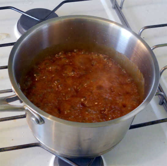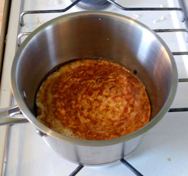 2. Vierta la crema caliente en la mezcla de azúcar. Comenzará a burbujear para arriba bastante. Por esta razón utilizamos una cacerola más grande. Revolver hasta que se mezcle completamente. Use mangas largas y use guantes si usted teme el caramelo se burbujas y quemaduras. Es muy caliente y puede quemar bastante mal.