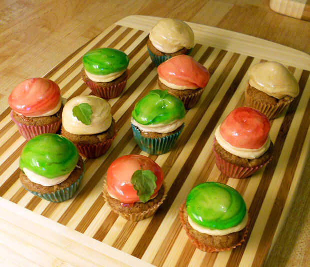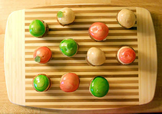 9. ahora usted tiene 3 colores de Mini caramelo caramelo Apple Muffins! Decorar con poco hojas de una hierba sabrosa, como bálsamo de limón o menta si lo desea. Usé el bálsamo de limón.