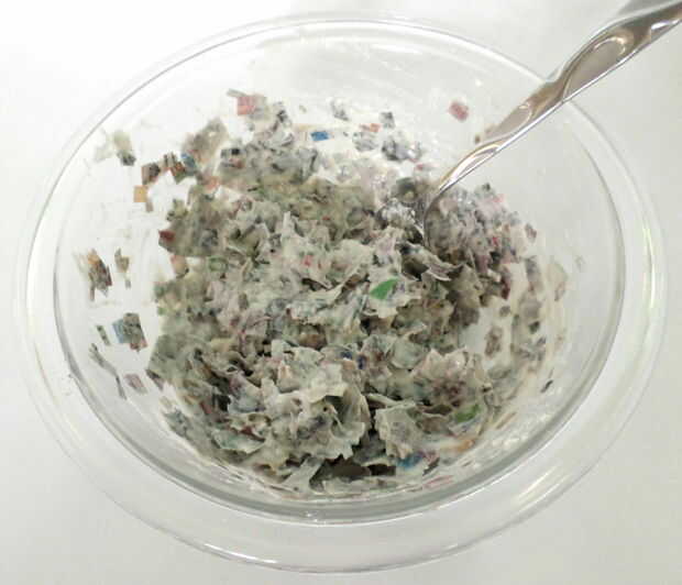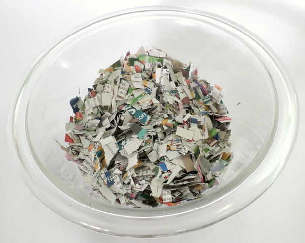 Corte el periódico en como fragmentos pequeños como sea posible. Lo hice cortando muchas capas (ligadas) en tiras, y luego cortar las tiras en un ángulo de 90 grados en pequeños cuadrados/rectángulos. Terminé haciendo que alrededor de 0,5 cm a 1 cm de largo. El más pequeño las piezas, la mejor que va a trabajar como pulpa. Preparar una taza de esta manera. (Si lo desea, ahora puede hacer más, necesitarás otra taza en el paso siguiente).