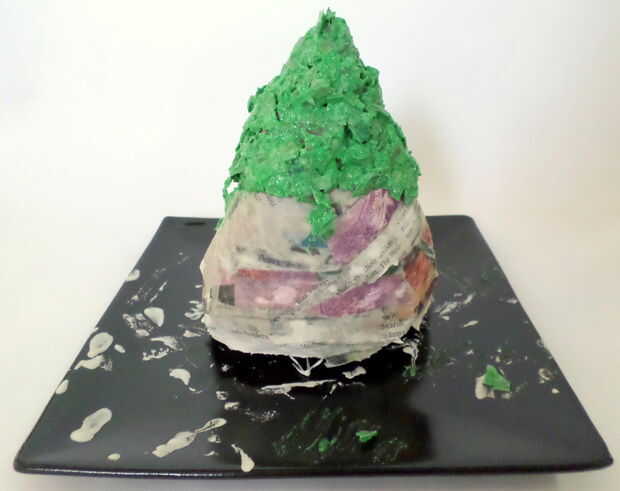 Poner en un par de guantes y use sus dedos para colocar la pulpa verde en el cono. Hice una capa de sólo lo suficientemente gruesa como para completamente cubra las tiras de papel maché – ver las imágenes de este paso por ejemplo. Al final, debería mirar mucho como un árbol!