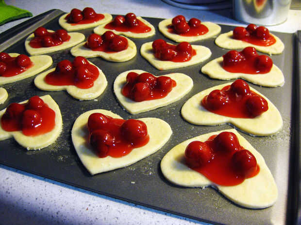 • Abierto puede de cereza pastel relleno. Cuchara de 3 cerezas en el centro de cada corazón.