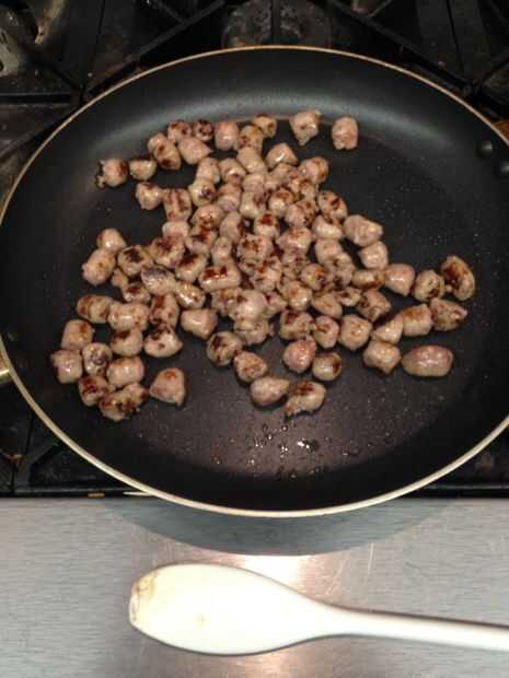 Precalentar el horno a 400 grados. En una sartén grande sobre fuego medio, cocinar el desayuno de 3/4 lb salchicha hasta que se doren. Desmenuzar y reservar.