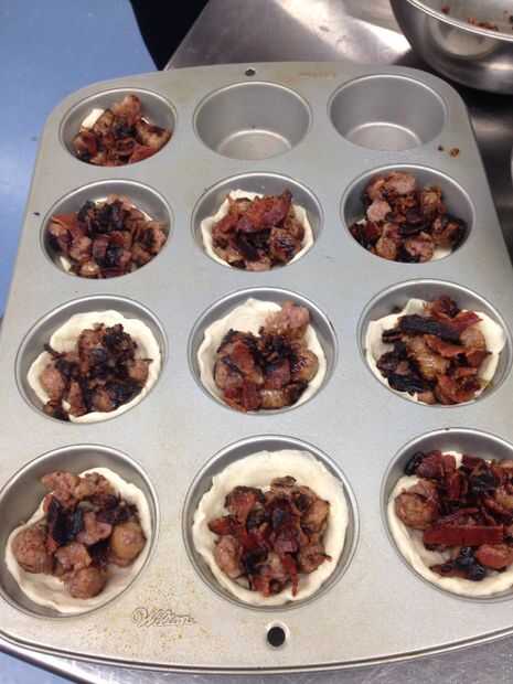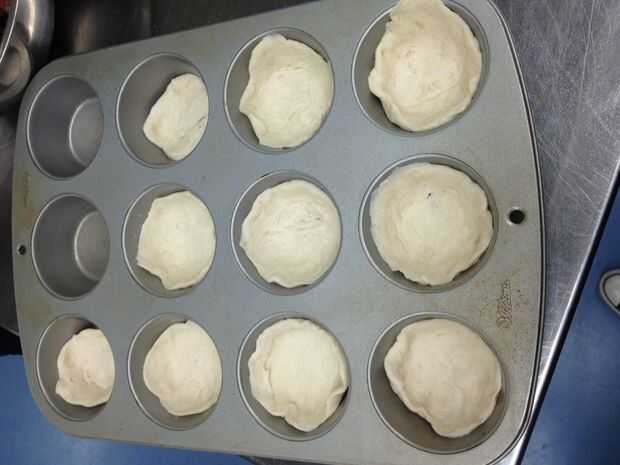 Use una lata de (12 oz) refrigerada masa galleta y separar la masa en 10 galletas. Línea de los fondos y lados de 10 latas del mollete y distribuir uniformemente la mezcla de la salchicha.