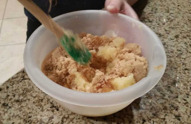 1.) combinan derretido mantequilla, piña machacada y panela hasta que todo esté uniformemente distribuida