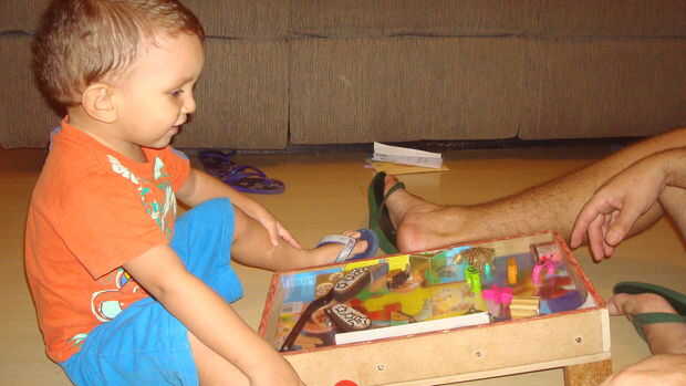 Esto es realmente un pinbal muy simple, no es mucho movimientos, sistemas y efectos. Sólo algunos bola caminos, puertas y luces y sonidos de otro juguete. Mi niño amado sólo, incluso sin tener idea de que la bola no llega al fondo pero se mantienen jugando tan largo como sea posible. Para él el movimiento de la muestra de la bola se lanza, patadas y regreso ya es maravilloso.