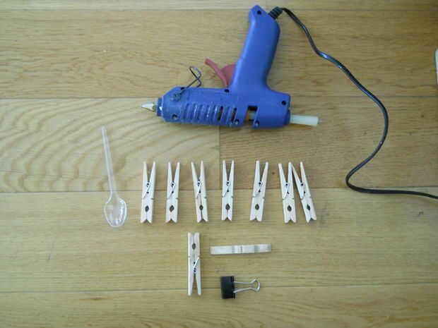 esto es una mini pistola con una sola pinza de madera, un pedazo de popslicle para hacer algunas partes más plano. También usé un tubo de bolígrafo vacía para dar mayor precisión y hacer un asa para tirar hacia atrás el gatillo de metal.