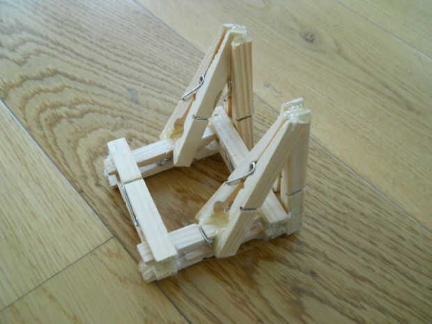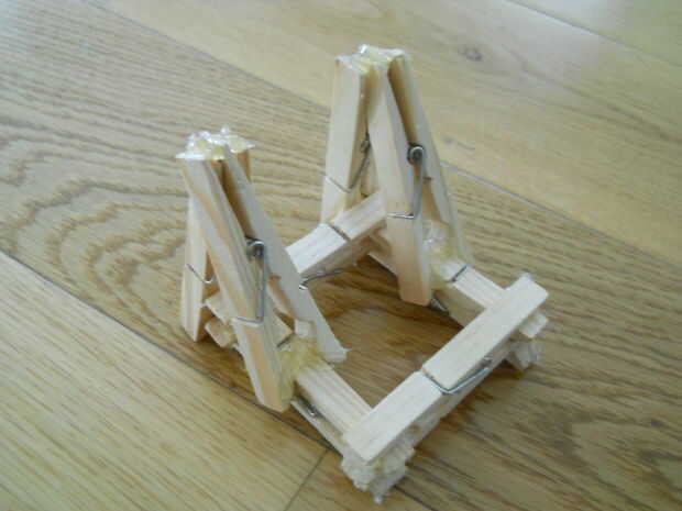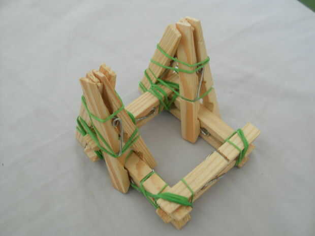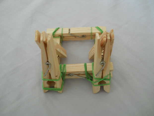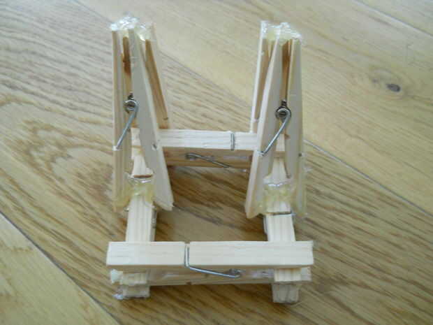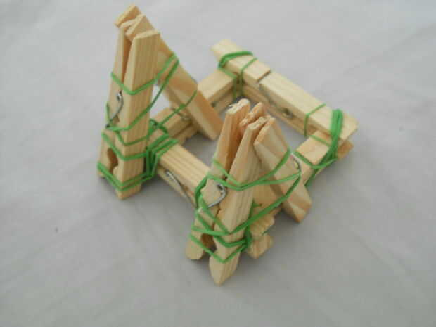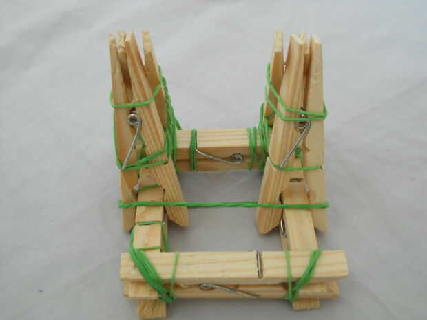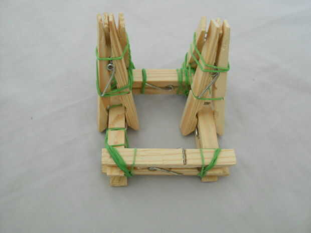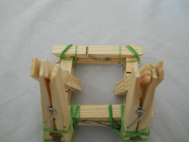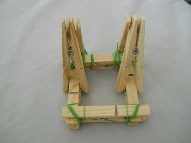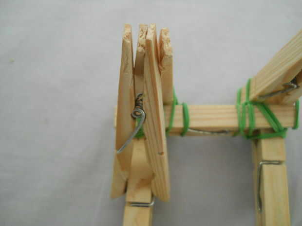 En primer lugar usted necesita tomar 2 pinzas más y sobre a medio camino de las dos pinzas para la ropa atamos en el paso anterior, en la base y luego el ángulo a 45 grados que entran en contacto con las dos pinzas atamos en el paso anterior, luego caliente pegarlos juntos si están haciendo la versión permanente , pero si es la versión temporal es un poco más difícil porque tendrá que torcer las gomas por lo menos 4-5 veces alrededor de éstos para conectar a la base y para hacerlos resistentes.
