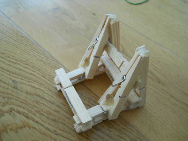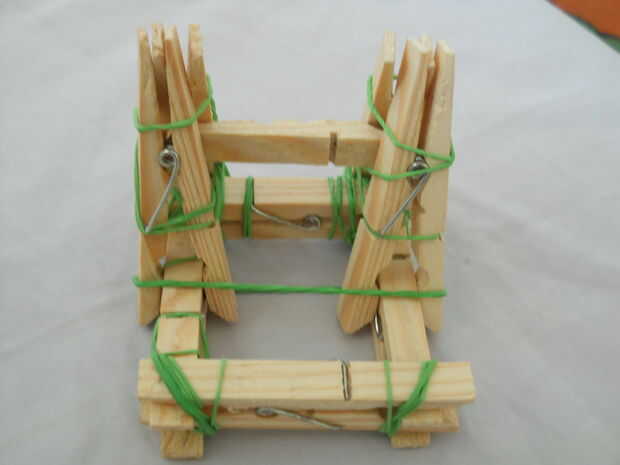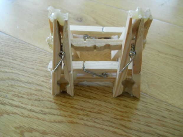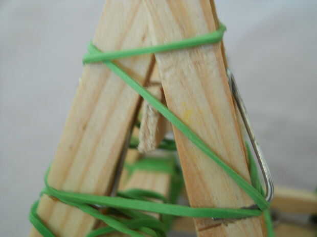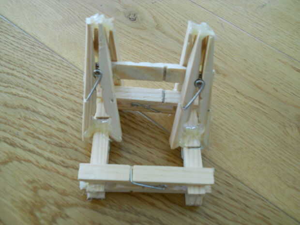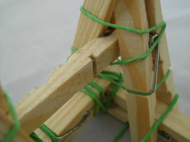 Primero tendrá que abrir la pinza para la ropa con pinzas o tijeras he usado ambos y abrir la pinza para la ropa, después de abrirlo debe tirar del resorte del metal en el centro y luego tomar una mitad de la pinza para la ropa y se coloque entre el marco hecho en los pasos 3 y 4, usando bandas de goma será un poco difícil pero lo podemos hacer!