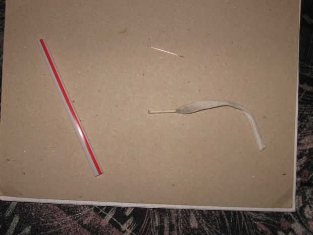 Lo primero que debes hacer es reunir los materiales. Usted debe tener todo ya, y muchos artículos pueden ser sustituidos. Necesita 1. Paja o lápiz hueco vacío, 2. La punta de un cordón o una cadena de sudadera con capucha, 3. Aguja de coser, safetypin o algo similar con un punto agudo. Una vez que tengas tus materiales es la Asamblea. Para este ejemplo estoy usando una pajita de un lugar de comida rápida, una punta de un cordón de un viejo par de fuerzas del delta y una aguja de coser.