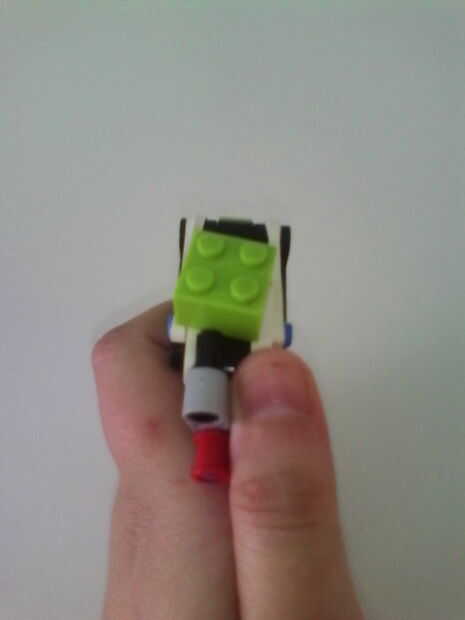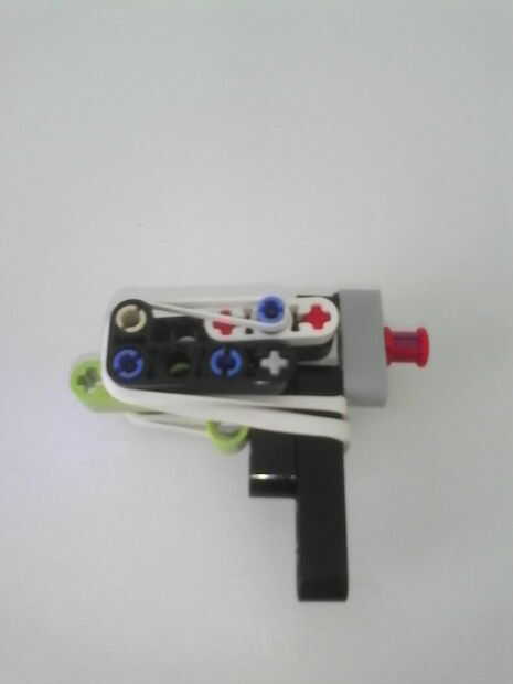 Doblar el cañón de la pistola en y bloquéelo con la parte tres-estudié con una clavija en. Añadir munición encima de todo... y disparar empujando hacia el lado que parte de tres studed que sostiene el cañón doblado. La pistola dispara a unos 10 metros de distancia.