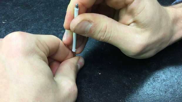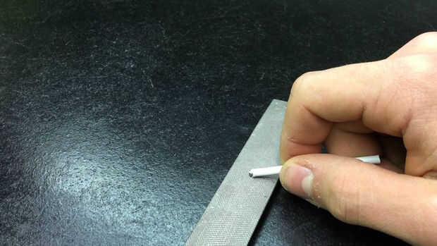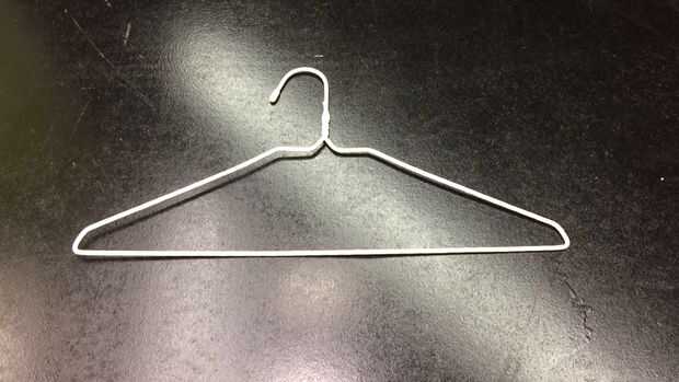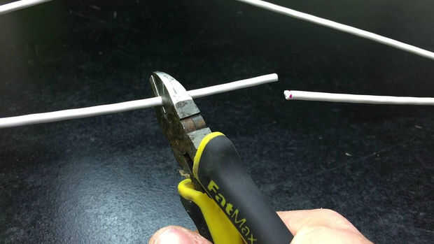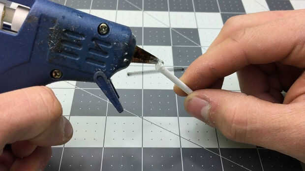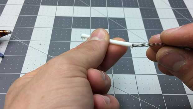 Para hacer nuestro barril vamos a coger una percha y cortar una pieza que mide 5,6 cm de largo y eliminar la pieza de metal en su interior. Para quitar la pieza de metal necesita presentar los lados de un extremo para hacer más fácil al retirar el tubo de plástico. Esto es donde irá la primavera, así que podríamos también encolarla ahora mismo. Sólo al final de la primavera tendrá que pegar al final del cañón para que el resorte no sale cuando se está comprimiendo.
