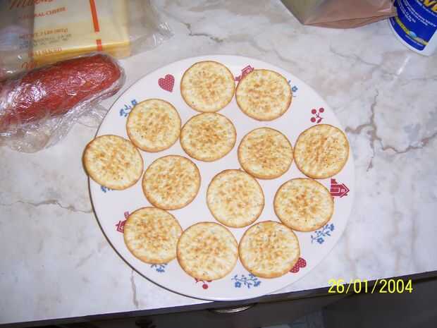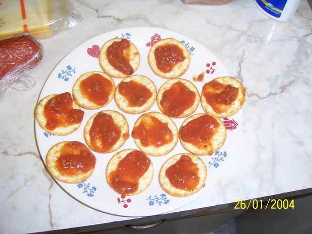 Ok así que esto es muy sencillo aplicar crakers en su charola o placa y poner en barbecho de la salsa de queso y pepperoni.