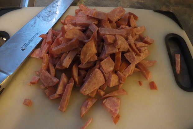 Pique 1 taza de pepperoni en rondas luego rodajas