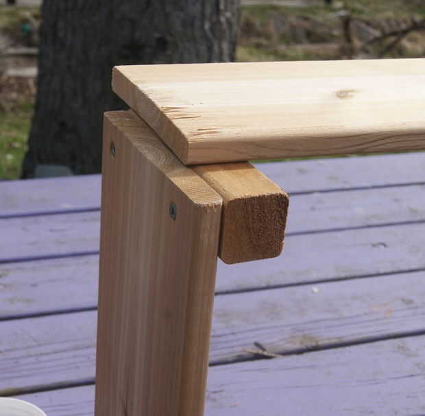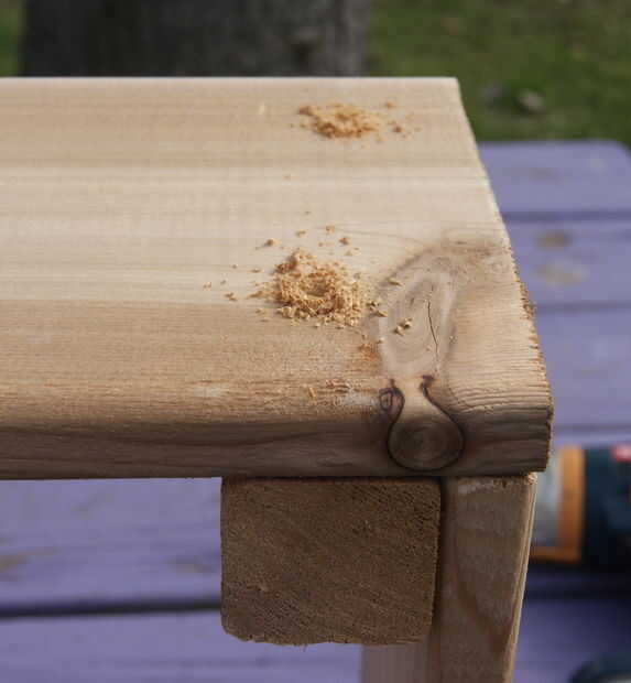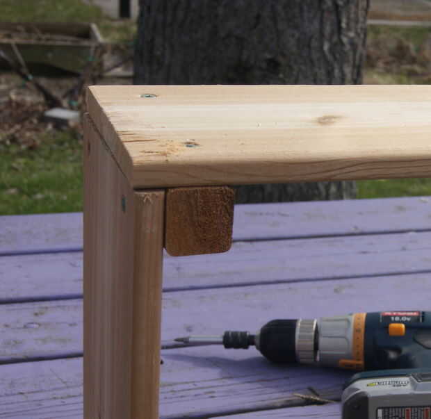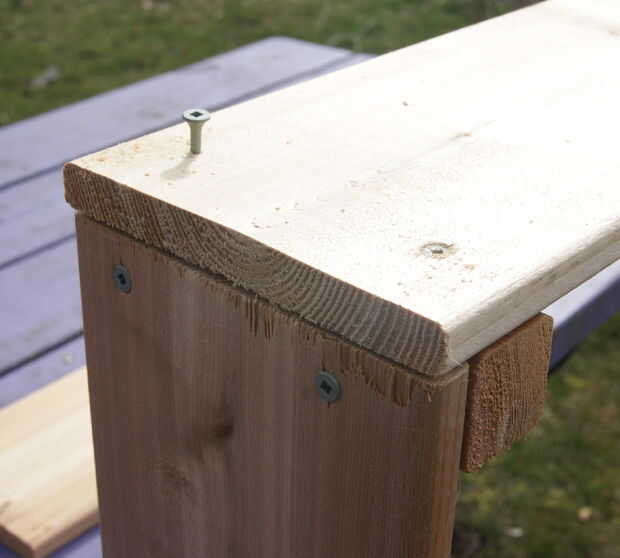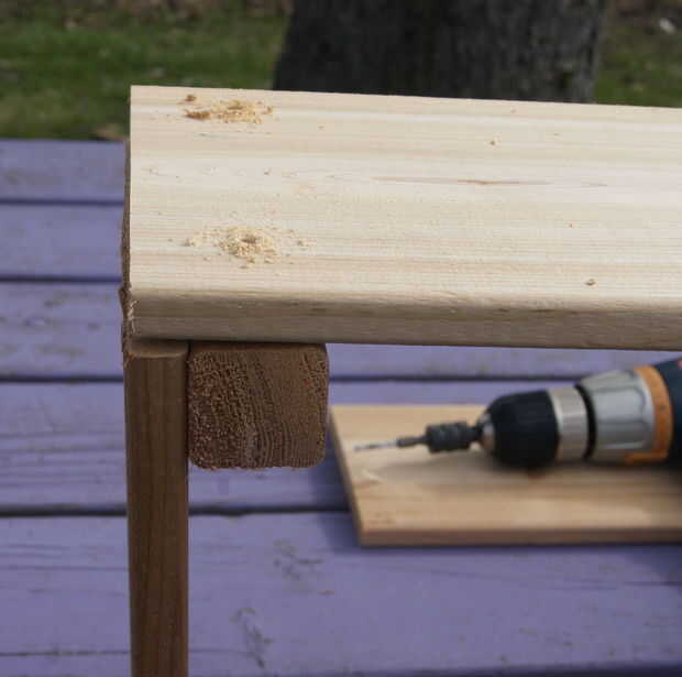 Soporte los dos lados de modo que la esquina refuerzos de cara hacia la otra (como []). Coloque uno de los lados cortos encima de ellos con el borde de la tabla corta haciendo coincidir con la superficie del lado largo. Taladre los orificios piloto para que los tornillos se pondrá en el apoyo de la esquina (aproximadamente 1 1/2 pulgada de borde de tabla corta). Si no tienes un ayudante, será más fácil poner los tornillos de la cubierta, luego línea de taladro y atornillar el segundo final.