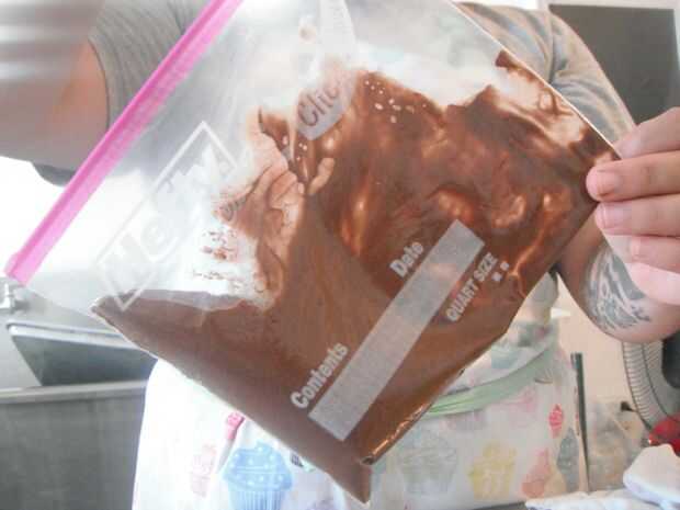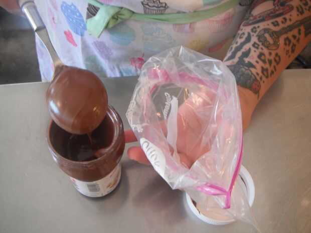 Para hacer este paso la Nutella tiene que estar a temperatura ambiente y ligeramente drippy así que será más fácil de administrar. Si no, me vino esa cosa en el microondas! Tome una bolsa de ziplock y doblar dentro nuestro un poco así que puede disponer el Nutella mejor con menos lío. Después de verter la Nutella en la bolsa, sellarla y empezar a moverse la Nutella con la mano a una esquina de la bolsa. Esto hará que la Nutella de tuberías dentro del recipiente de vidrio mini más fácil. Dejar reposar hasta que tengamos todos los ingredientes hacer.
