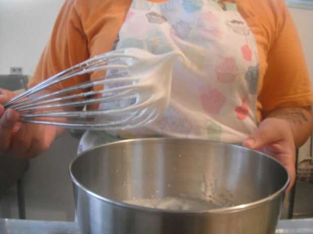 Como he dicho antes de que no necesariamente necesita hacer el merengue, si no tienes tiempo o músculo para armar este lo acabo de comprar crema de látigo en el supermercado. Pero si quieres probar, 1/2 taza de azúcar de caña blanco y verter en un bol. Entonces romper algunos huevos y separar las claras de huevo de la yema, de desechar las yemas en el fregadero y agua corriente es en limpiar el área después de. NO se deshaga de las claras de huevo! Verter las claras sobre el azúcar y empezar a batir tan rápido como usted puede o usa un mezclador electrónico, pero por favor no bate o se obtendrá materia blanca grumosa! Y lo que queremos es merengue cremoso suave. También puede Agregar 1/4 cucharadita de vainilla blanca o extracto de almendra antes de mezclar. Para comprobar si el merengue se hace tratar de hacer picos con él, si se yergue entonces mis amigos hacerlo.