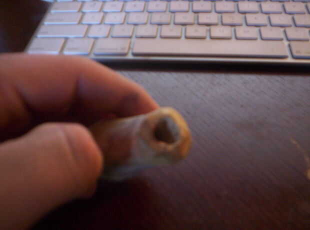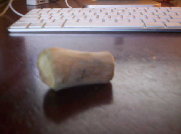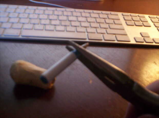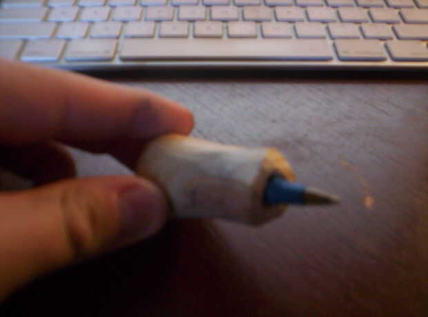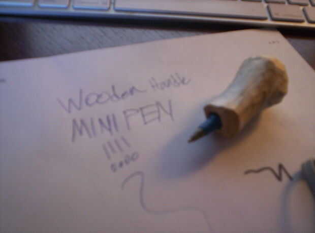 Sucede que tiene esta pequeña pieza de pino de un antiguo campamento que yo había tallado en. He decidido taladrar un agujero en un extremo y pegar la pluma mini en. Ayuda si usted sólo tiene que utilizar el tubo de tinta y la punta; de lo contrario tienes que tener un poco más grande y el riesgo de perforación demasiado hacia fuera.