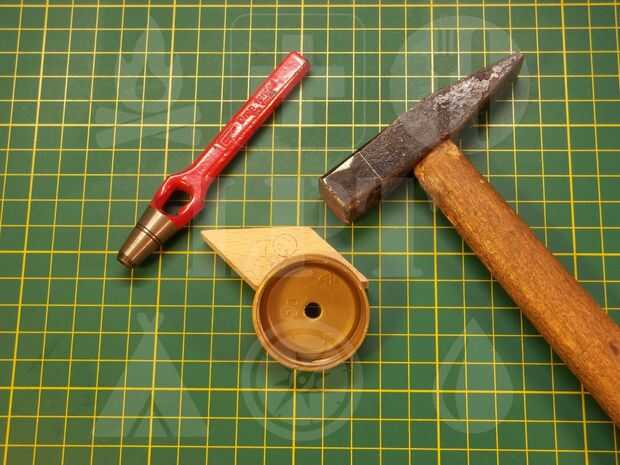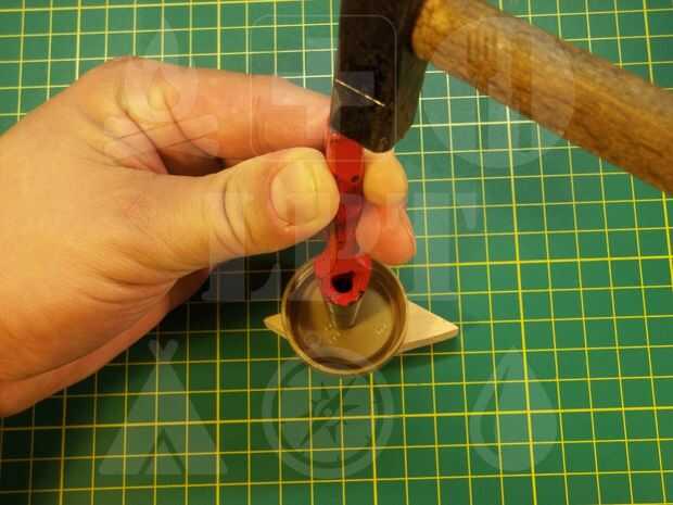 Colocar la tapa de la botella en la superficie de trabajo y el sacador de agujero en el centro. Utiliza tu martillo para perforar un agujero a través del tapón.