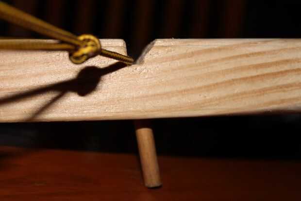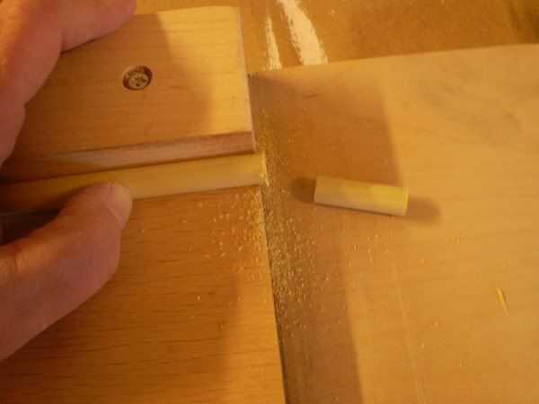Corte un pedazo de taco que es aproximadamente una pulgada más larga que la profundidad de la madera y esto se convierte en su disparador ya que pasa por el agujero y es empujado hacia arriba para liberar la cadena.