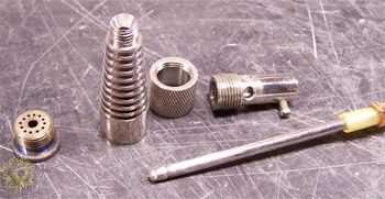 El quemador actual es especial, debido a la aplicación del disector. Mantiene la estabilidad de la llama en toda la zona de presión (dentro de límites razonables, sin duda), es de 0,2 hasta 3 kg/cm2. Volumen de aire no serán controlada. Este volumen es limitado debido a los diámetros de los orificios de la bomba. Si necesita controlar el poder de golpe, conviene poner el trozo de tubo de silicon en anillo con nudo. Control está disponible mediante la rotación del anillo. El diámetro seleccionado de la boquilla es de 0,12 mm.