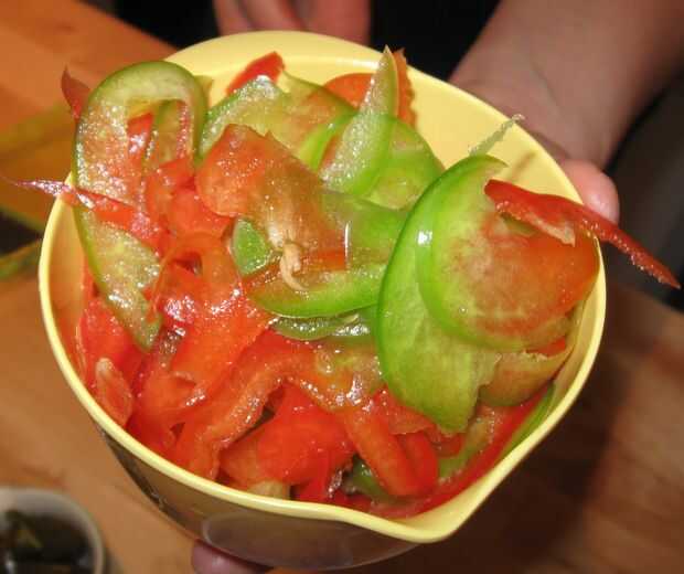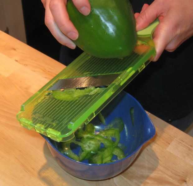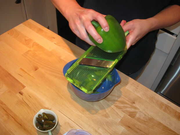 Es importante tener todos los ingredientes finamente rebanados. Use una máquina de cortar de Mandoline delgado cortes incluso.