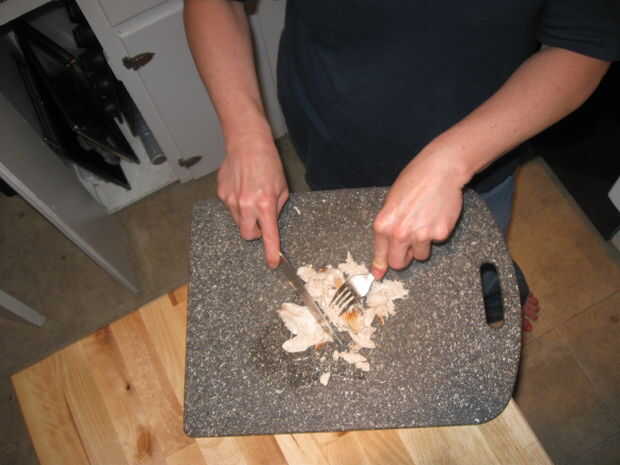 Retire el pollo de la sartén y coloque sobre una tabla de cortar.