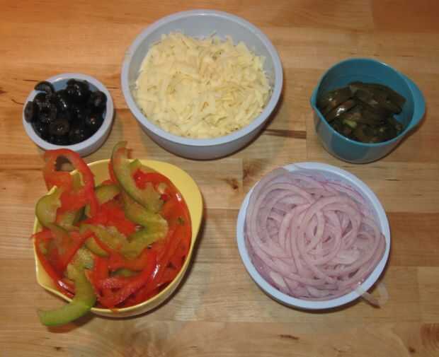 De la porción hacia fuera algunas aceitunas y jalapeños rebanadas en cuencos pequeños