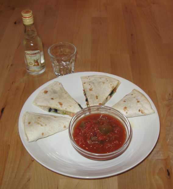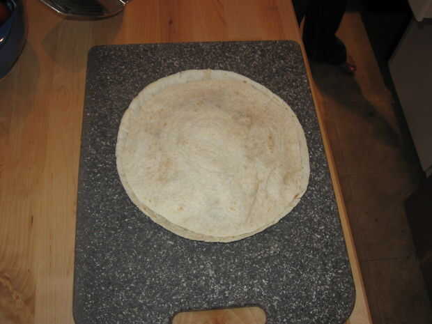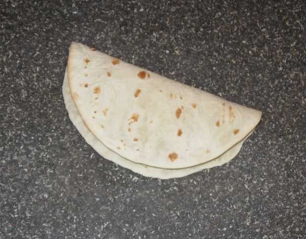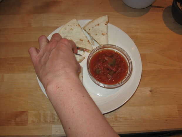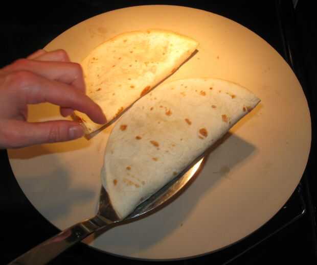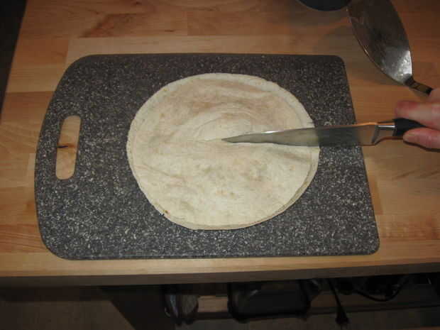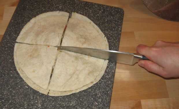 Lugar la quesadilla calentada a fuego resisten sección y tabla de cortar todo el redondo en 8 secciones iguales (o la doblada en 4 partes iguales) con un cuchillo de cocina afilado.