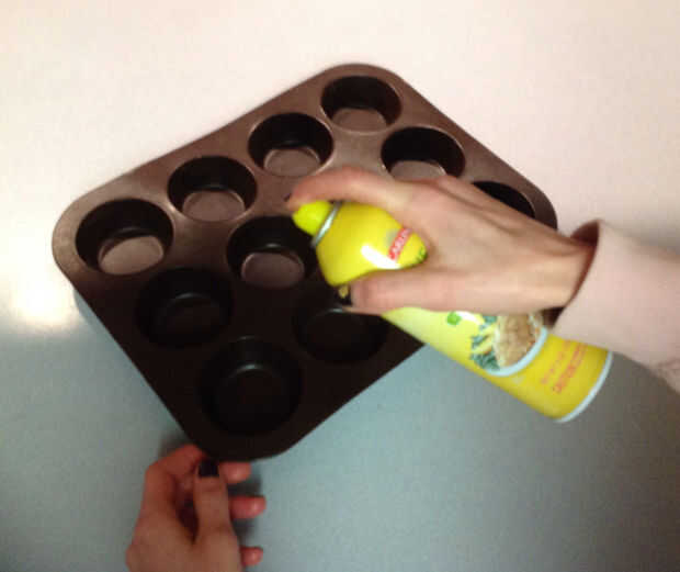 En primer lugar, rocíe su lata del mollete con spray de cocina.