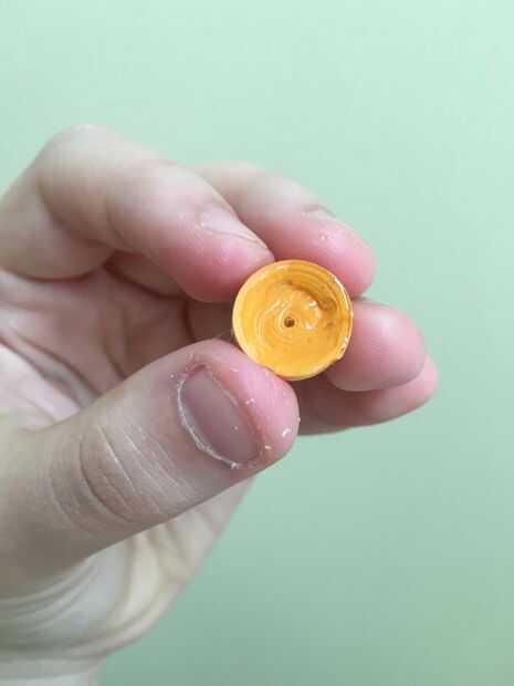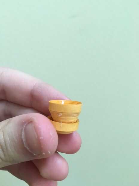 Tome dos de las tiras de naranja y encolarlos. Con la herramienta quilling, la tira larga de la bobina en una bobina apretada y encolado al final. Con el extremo posterior de la herramienta quilling, presione suavemente en el centro de la bobina a la forma de pote. También puede utilizar el dedo para hacer el pote redondo y 3D. Unte el pegamento en todo el interior de la olla para evitar que se deforme. Ahora han hecho la forma de pote. Para hacer la placa, unir las otras dos tiras de naranja y hacer la bobina apretada, pegado abajo al final, esta vez presionando menos para hacer el borde extremo del círculo un poco más alto que el centro. Otra vez, Aplique pegamento en el interior de la placa para evitar que se deforme. Al hacer esto, coloque la parte de la olla en el centro de la placa y dejar secar. Ahora han hecho el bote!