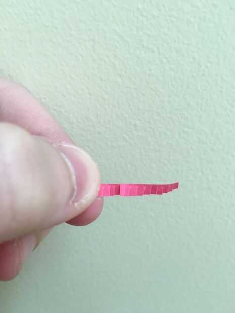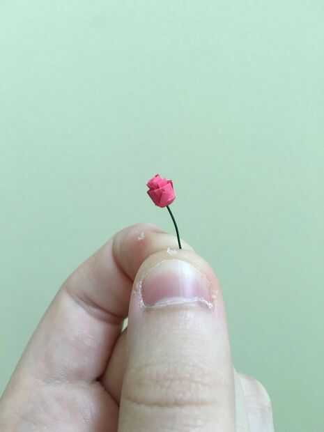 Para hacer las flores, mide 3 pulgadas en una de sus tiras de color rosa, ya sea claro u oscuro. Hacer pequeños cortes en el papel para que se vea fringy. Tenga cuidado de no cortar una sección del papel quilling en el proceso (créanme, lo hice un poco). Una vez que ha hecho esto, utilice la herramienta quilling, insertando el borde que no corte en la herramienta para enrollar la pieza de papel con flecos. Retirar la flor de la herramienta y pegar el extremo. Colocar un punto de pegamento en la parte inferior de la flor. Cortar un pequeño trozo de cable verde, cerca de 1-1.5 pulgadas e inserte en la parte inferior pegada. Deje seca y repetir con las otras flores. (Usted puede hacer tantas flores como quieras, pero solo hice 7.