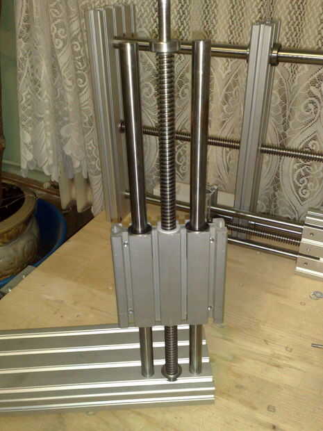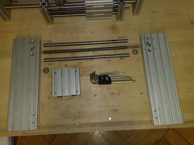 Lo primero que te tienes que hacer es montar todos los casquillos de la bola de Ø16mm y el Ø16mm Ø24mm tuerca trapezoidal 120 x 120 x 30 de aluminio de perfil como en el paso 6 y luego inserte los ejes en los cojinetes de bolas montado y el tornillo en la tuerca trapezoidal trapezoidal.