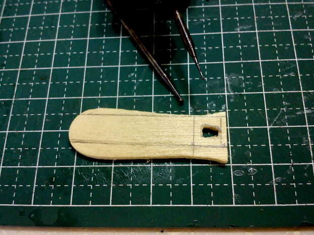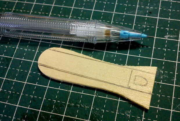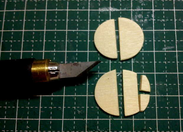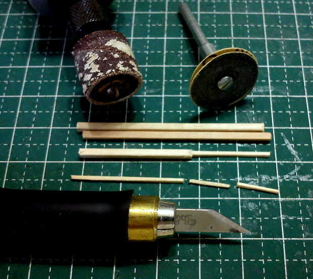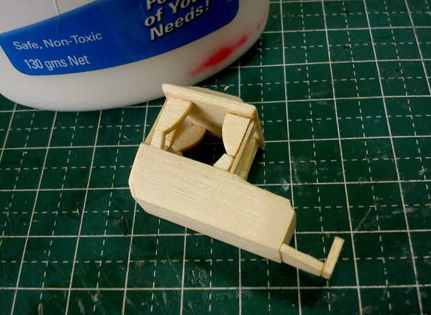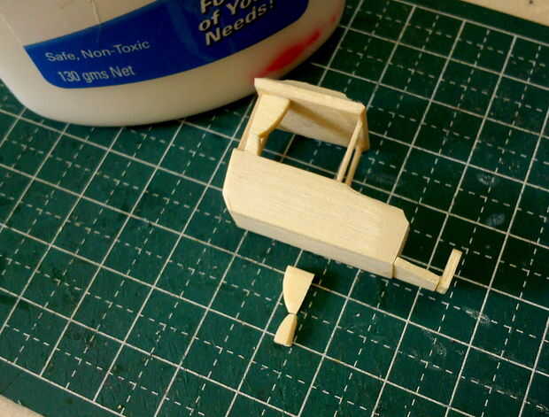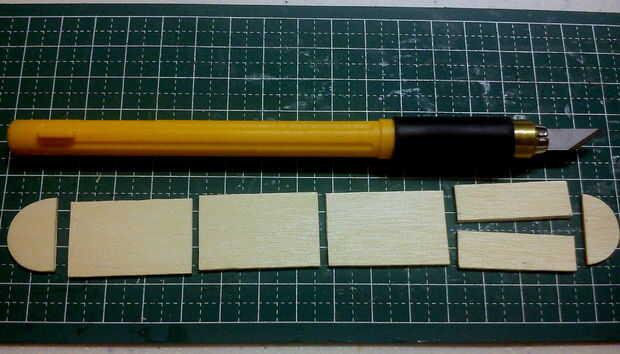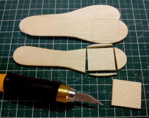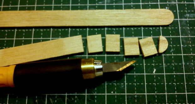8 ocho piezas fueron cortadas de un solo palito depresor de lengüeta de tamaño para el Creepy Coupe chasis y del cuerpo. Tenga en cuenta que los extremos redondeados del palito se utilizará más adelante para las cortinas de la carroza.