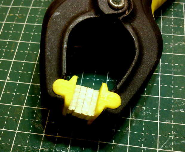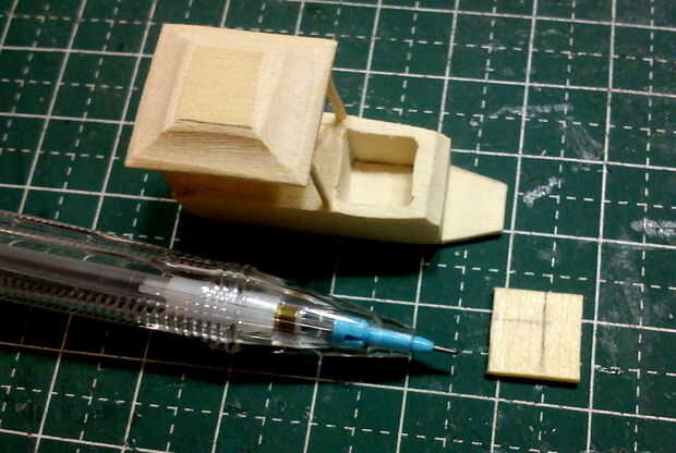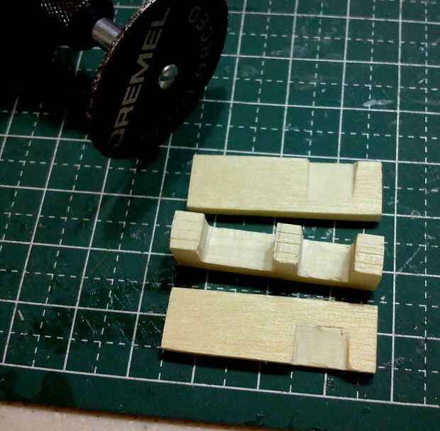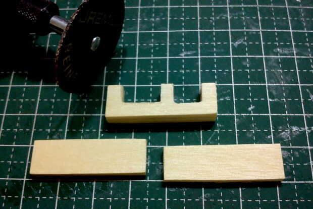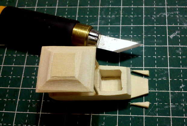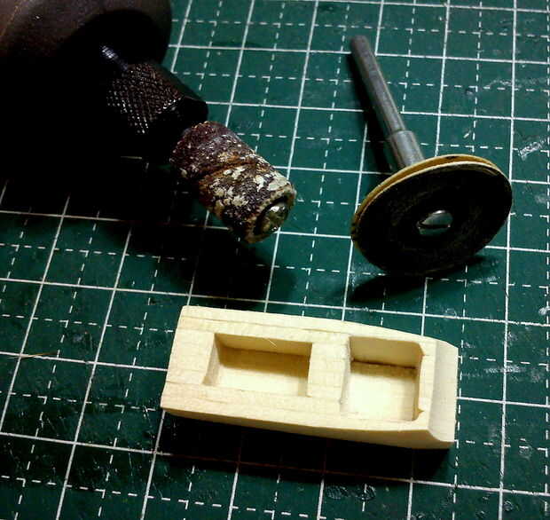 4 cuatro de los ocho 8 piezas inicialmente fueron laminadas juntos. Las ranuras fueron hechas para el compartimiento del conductor y coche fúnebre con el uso de un accesorio de disco de corte reforzado en un Dremel 3000. Las restantes piezas de 4 cuatro se utilizaron para sandwich juntos las partes ranuradas para formar el cuerpo del Coupe espeluznante.