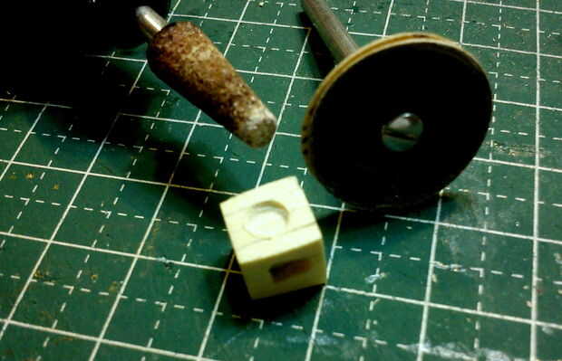 Quizás la parte más difícil de la construcción fue fabricación de la torre del campanario, particularmente windows de la torre del campanario. Tomó un tiempo para tallar hacia fuera las ventanas usando el #107 & #110 cortadores de grabado después de un pequeño orificio piloto se hizo con un accesorio de corte de alta velocidad #125. Como puede verse en las fotografías, la forma de las ventanas eran bastante crudo. No he encontrado un accesorio de la Dremel que puede tallar tan pequeña y delicada forma (todavía).